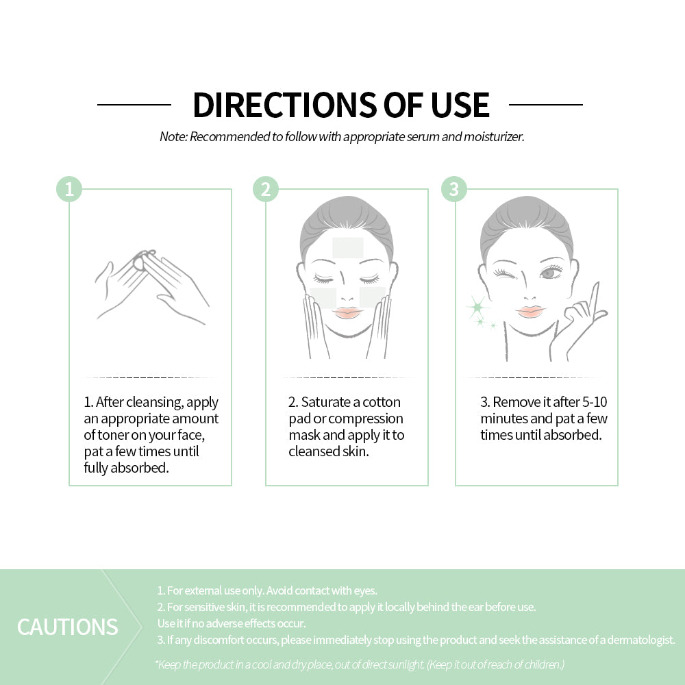 2.Saturate a cotton pad or compression mask and apply to cleansed skin, remove it after 5-10 minutes and pat a few times until fully absorbed.