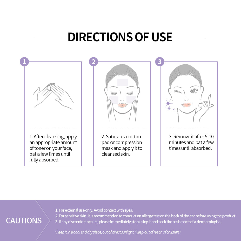 1.Selepas membersihkan muka, sapukan jumlah toner yang sesuai pada muka anda, tepuk beberapa kali sehingga meresap sepenuhnya.